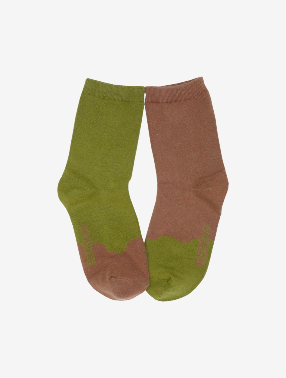 Noggal iow, a conversation of brown and green. Soft cotton socks. A collaboration with the footwear brand itsownweight.